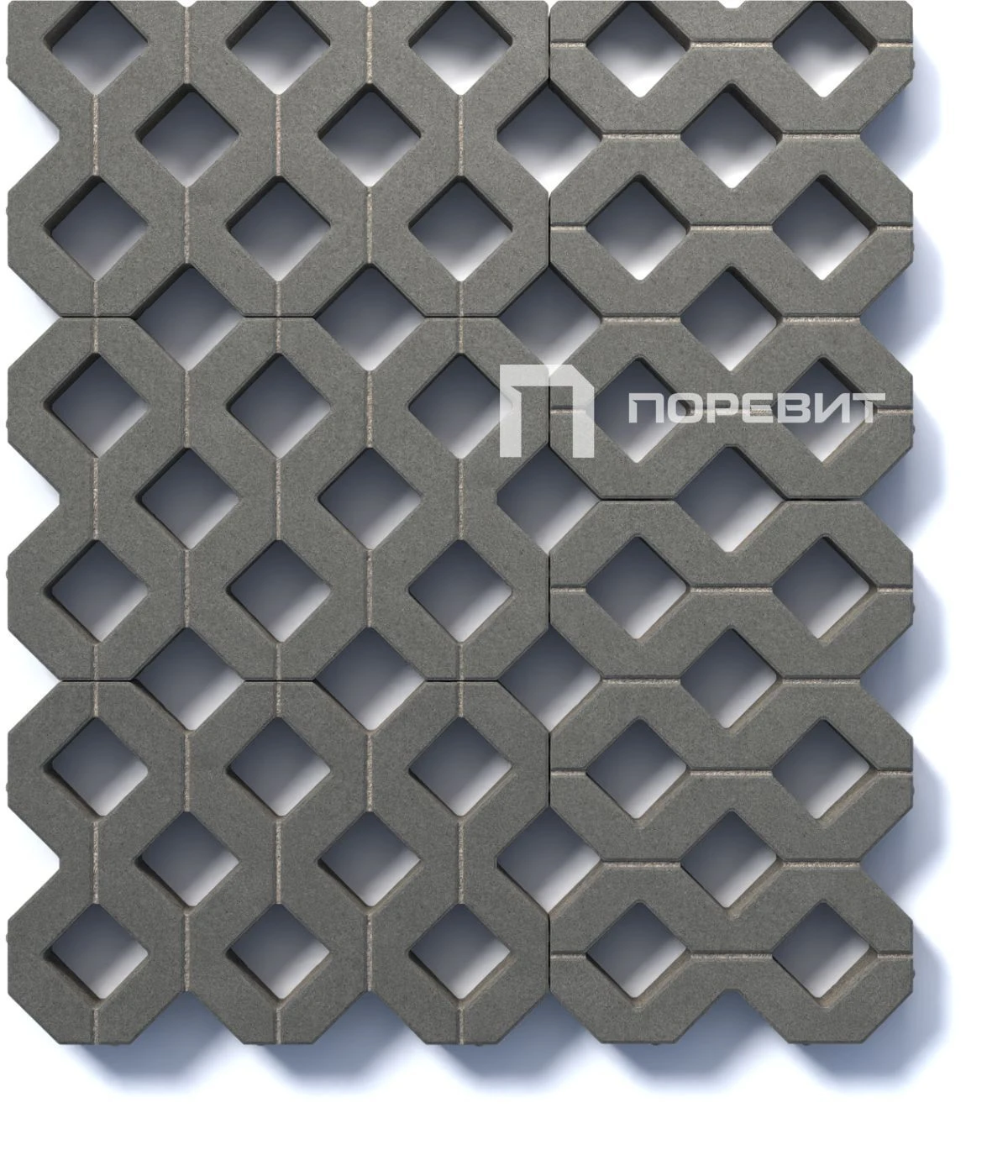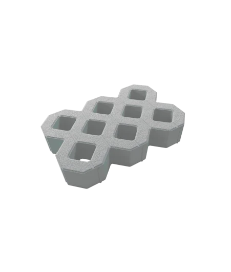 Система модулей с ячеистой структурой. Изготавливается по уникальной технологии методом полусухого вибропрессования из бетона. Модули предохраняют корневую систему растений или газона от механических воздействий. Стенки ячеек берут на себя основную нагрузку – вес пешеходов, автомобилей. Полости ячеек можно заполнять декоративно-насыпным материалом или засеивать газоном.