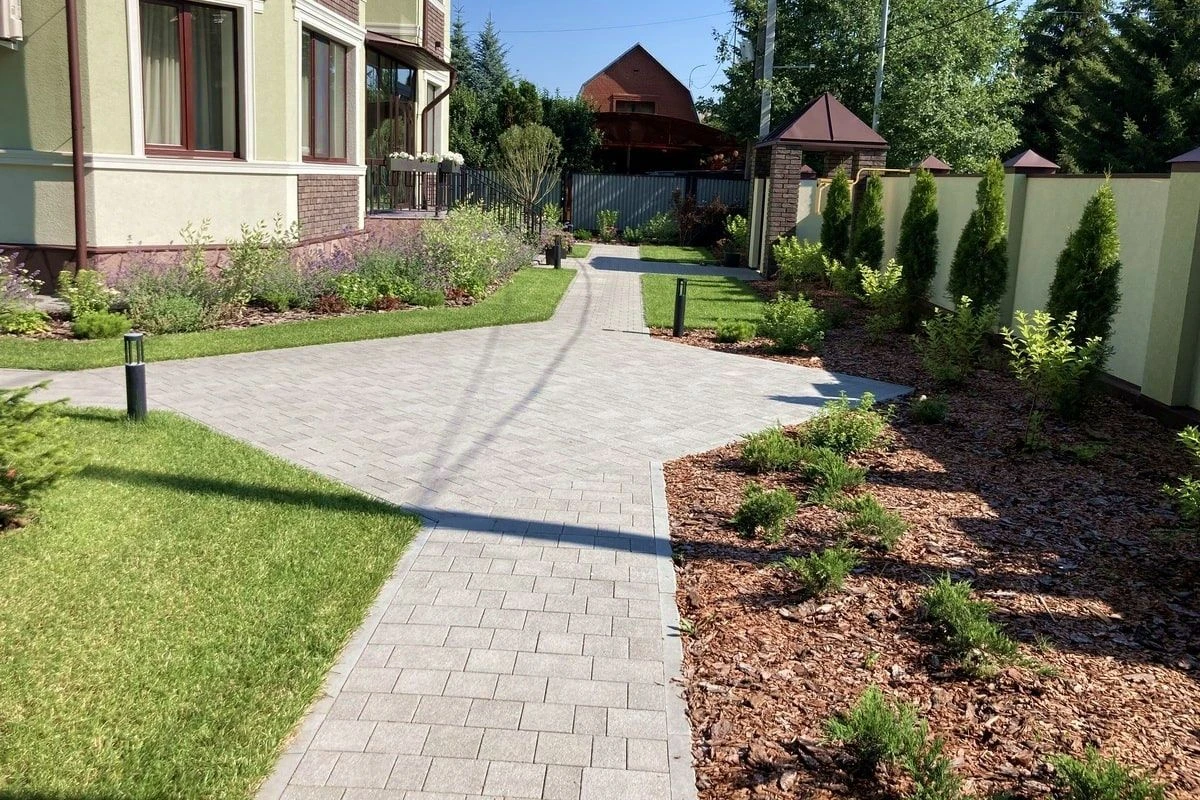 Для реализации проекта была уложена тротуарная плитка в коллекции Гранит серого цвета, пошаговые дорожки, а также выполнено озеленение, мульчирование участка.
