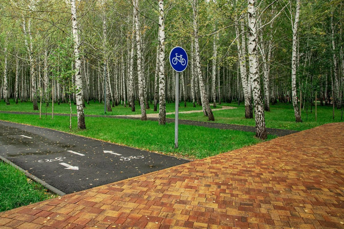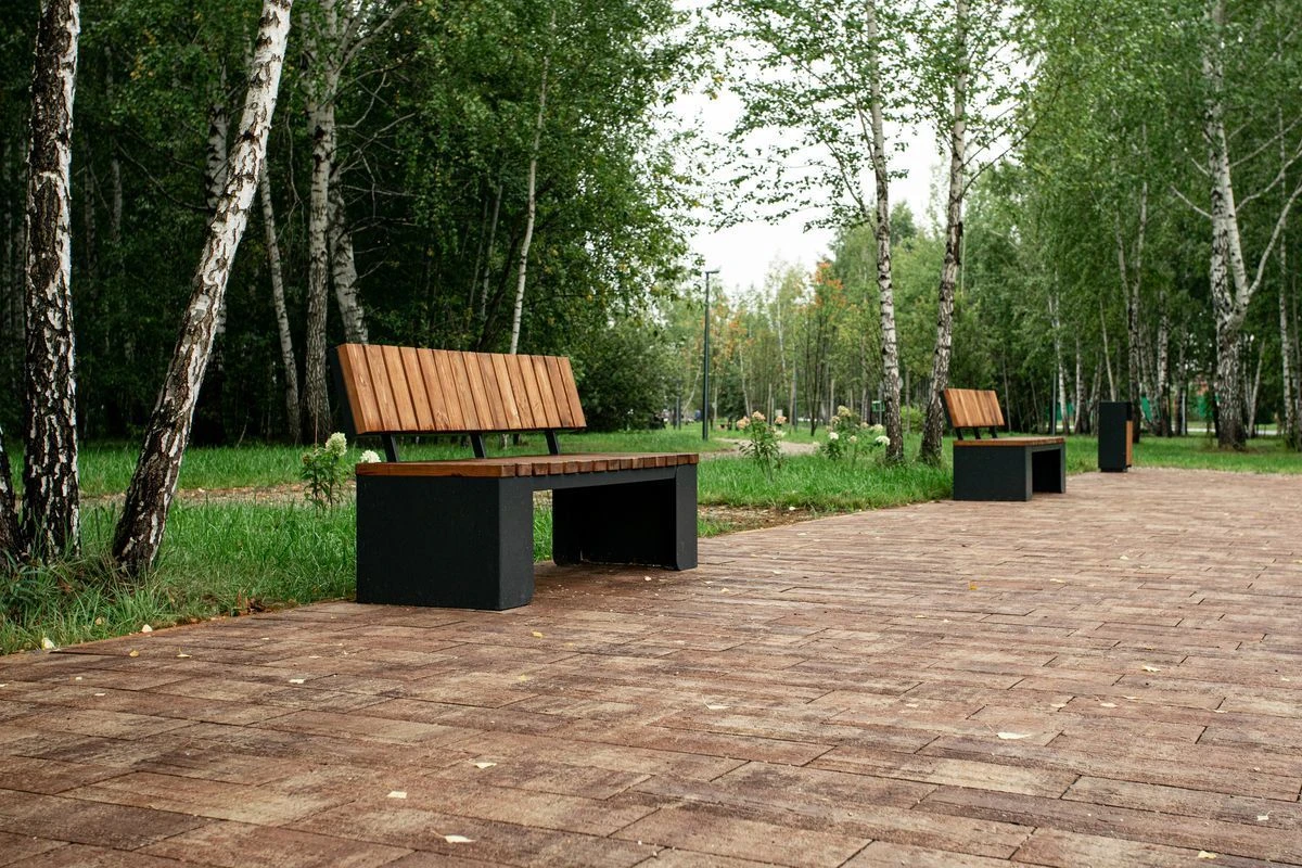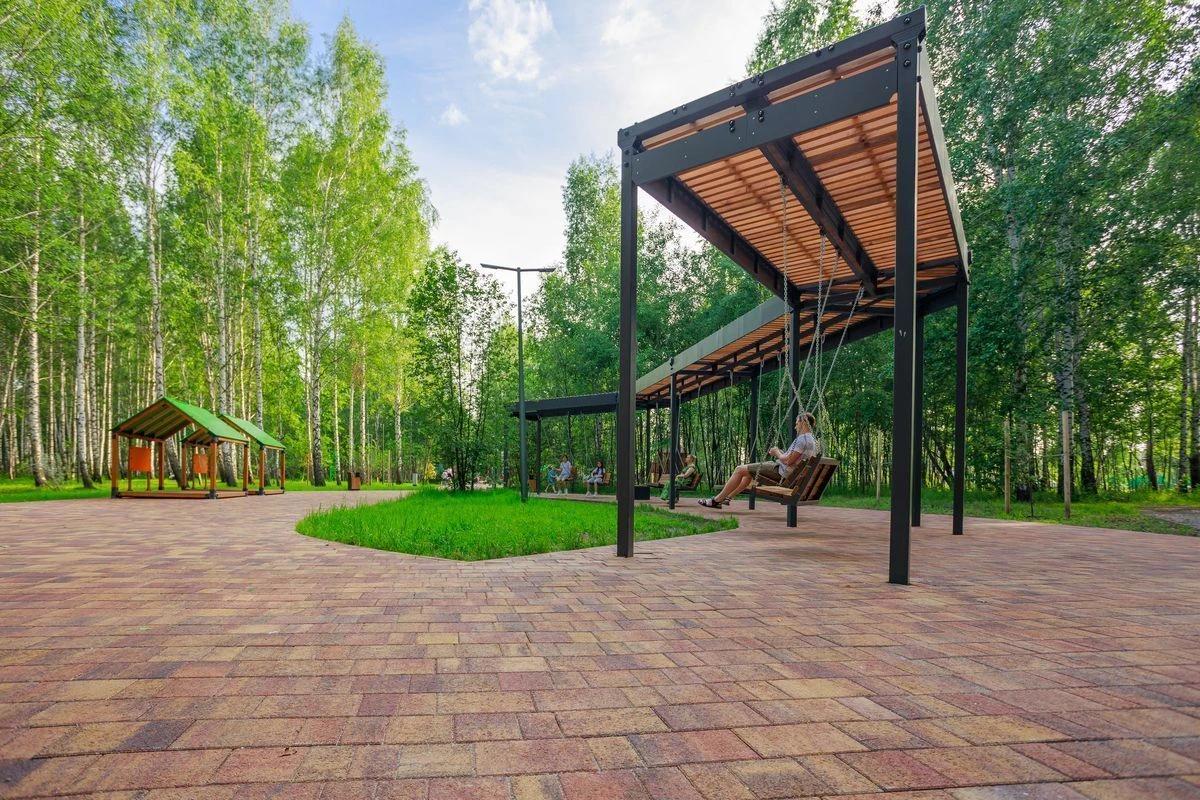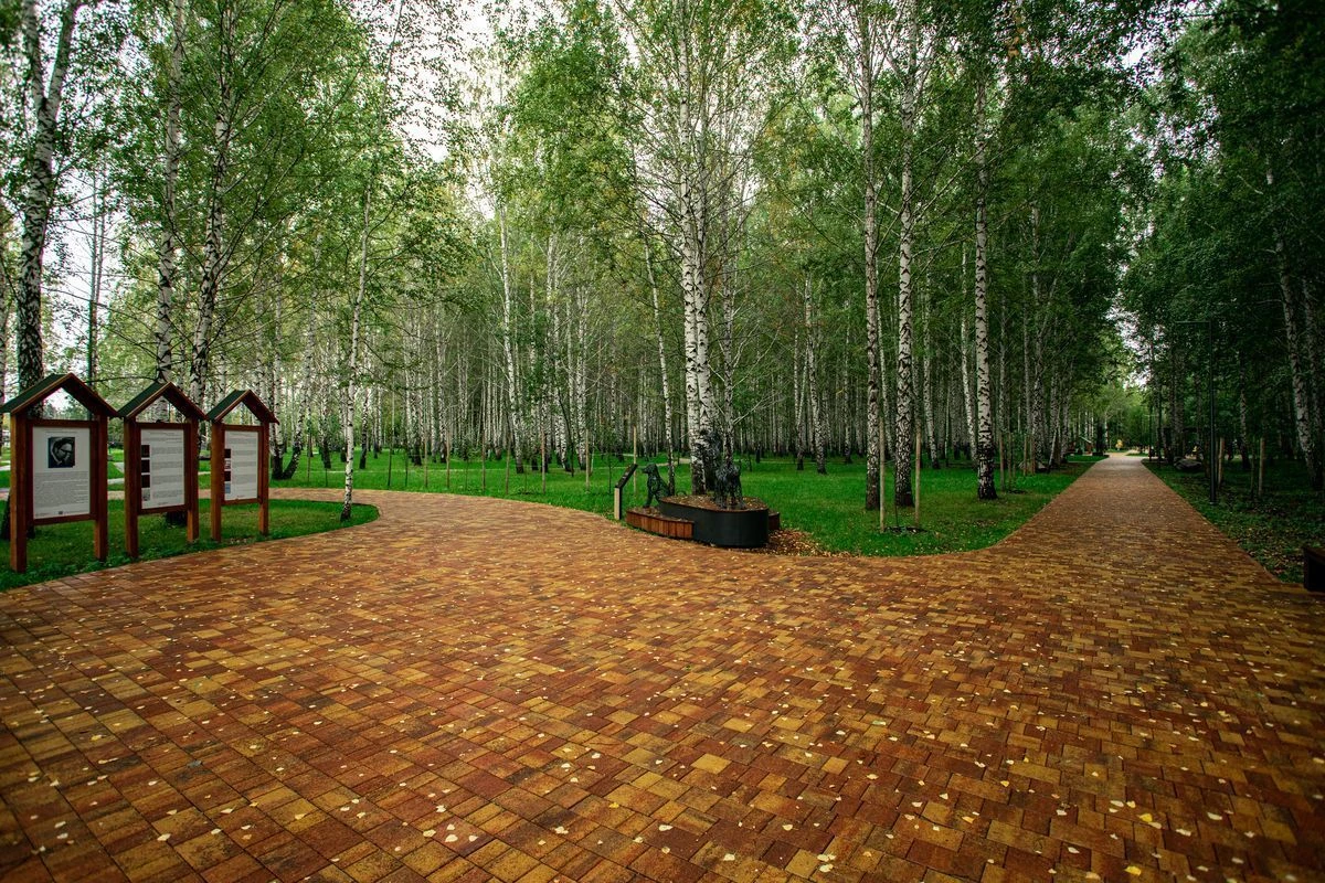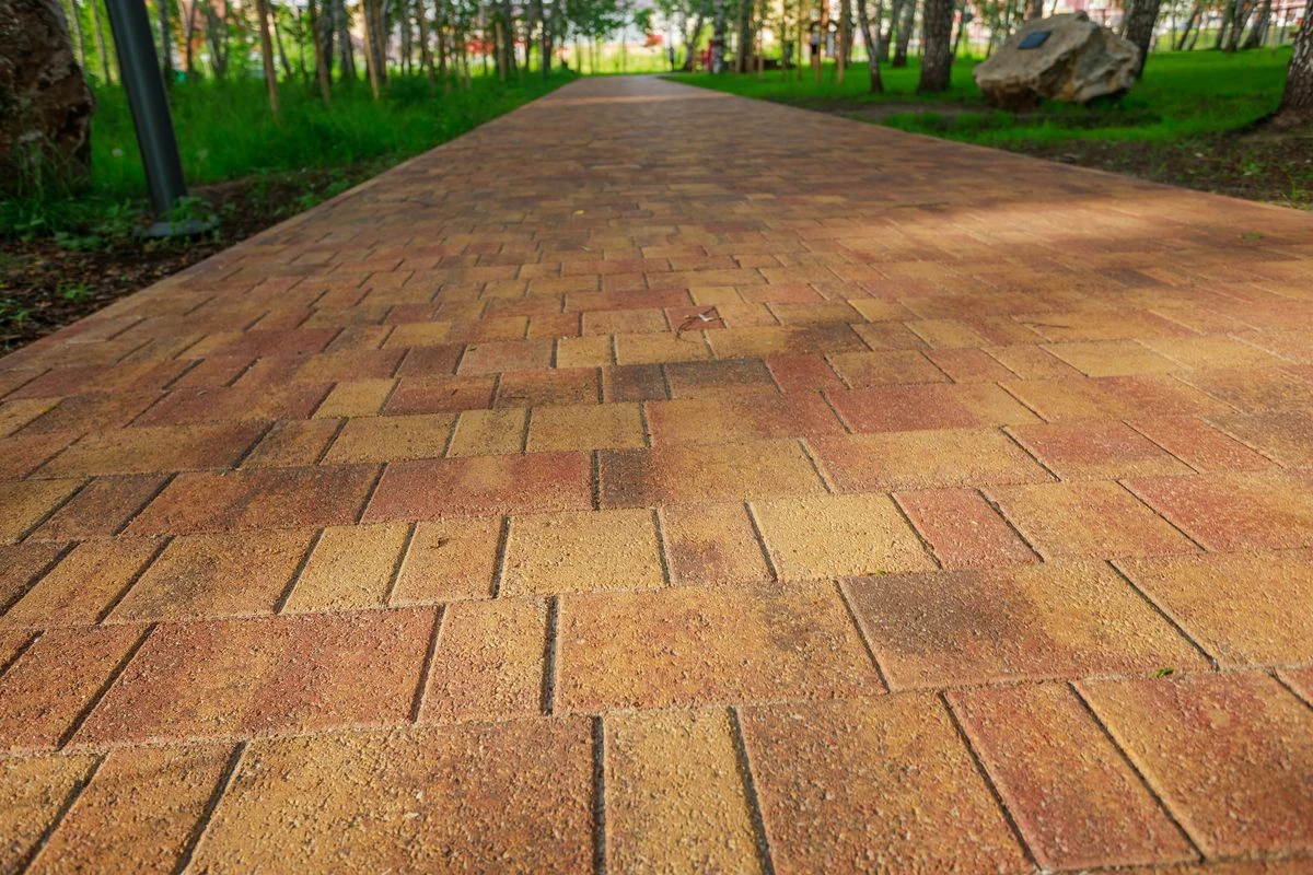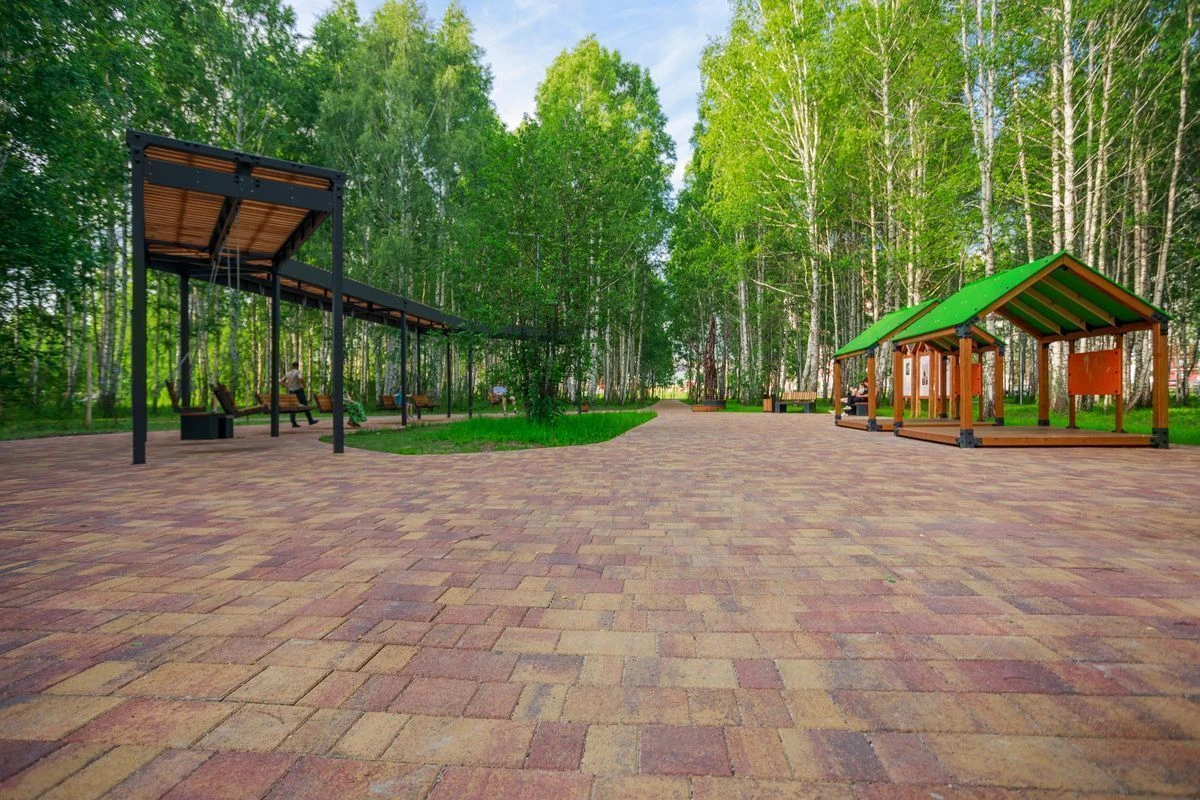 Для пешеходных дорожек в парке использована в том числе тротуарная плитка "Поревит": Арбор в цвете Орех и Старый город в цвете Осень.