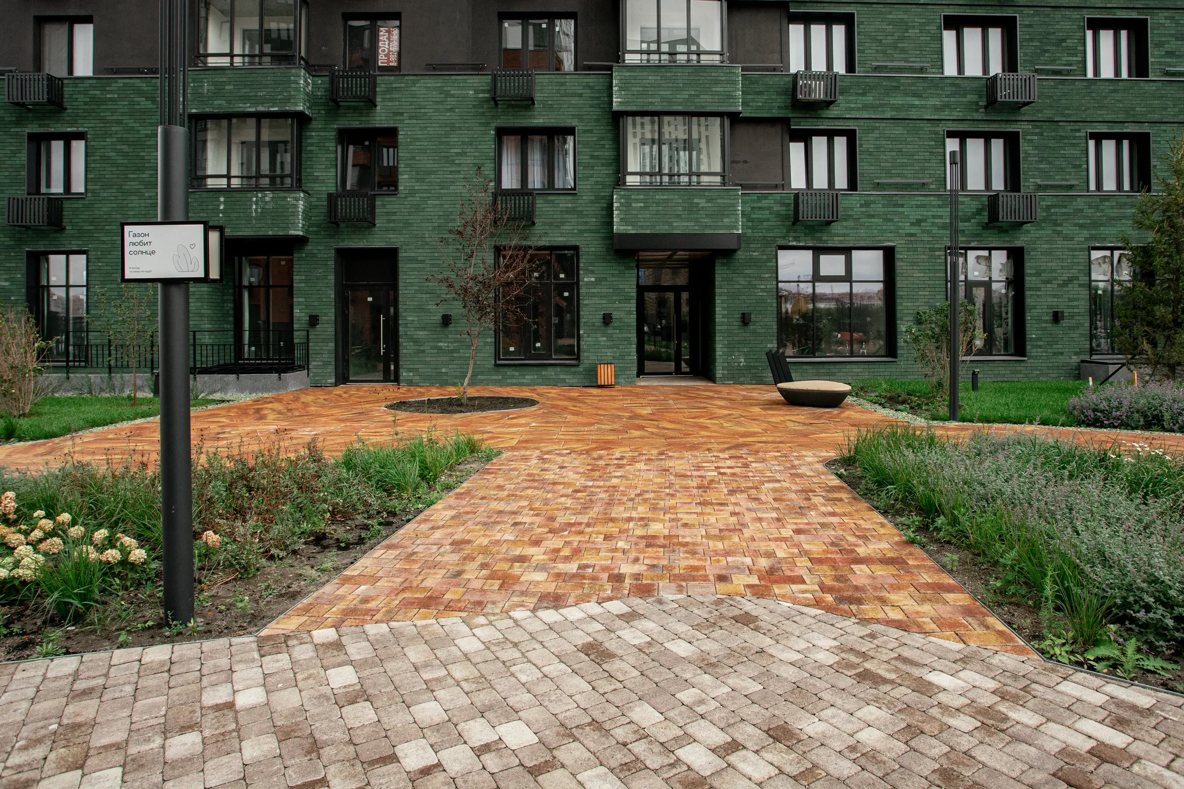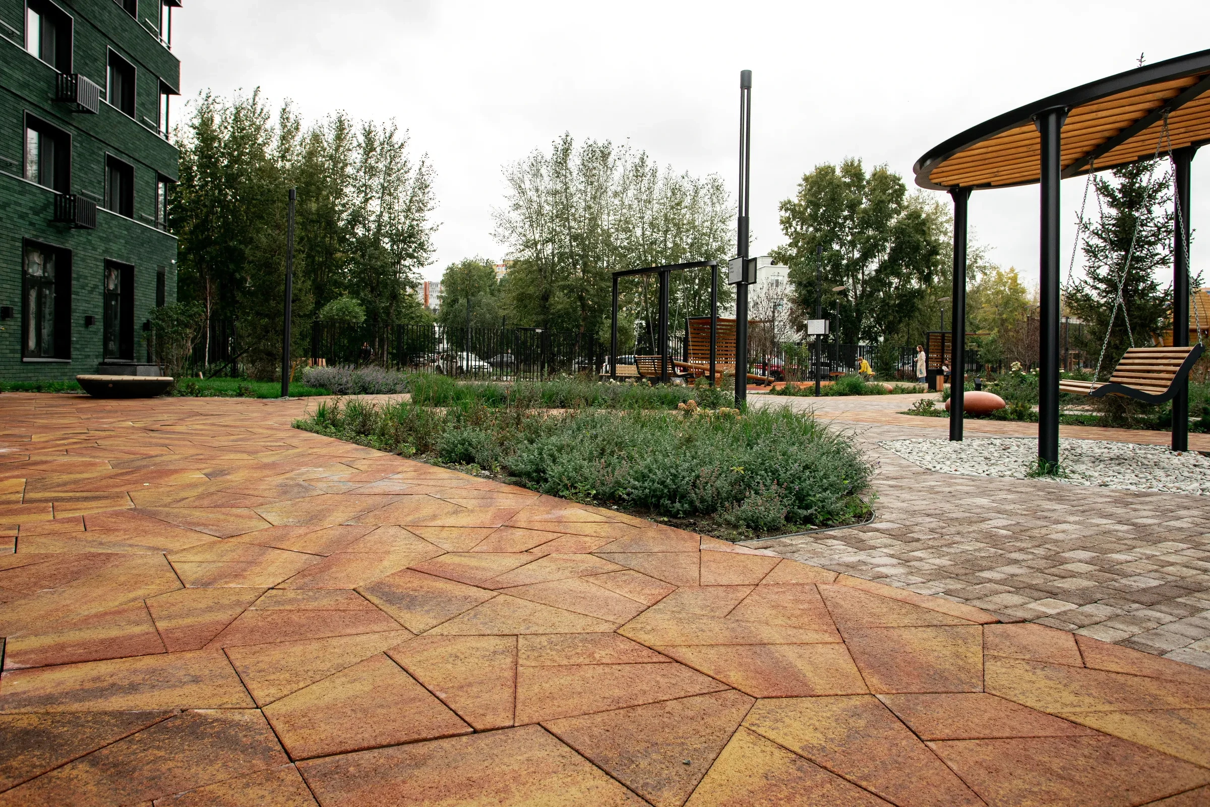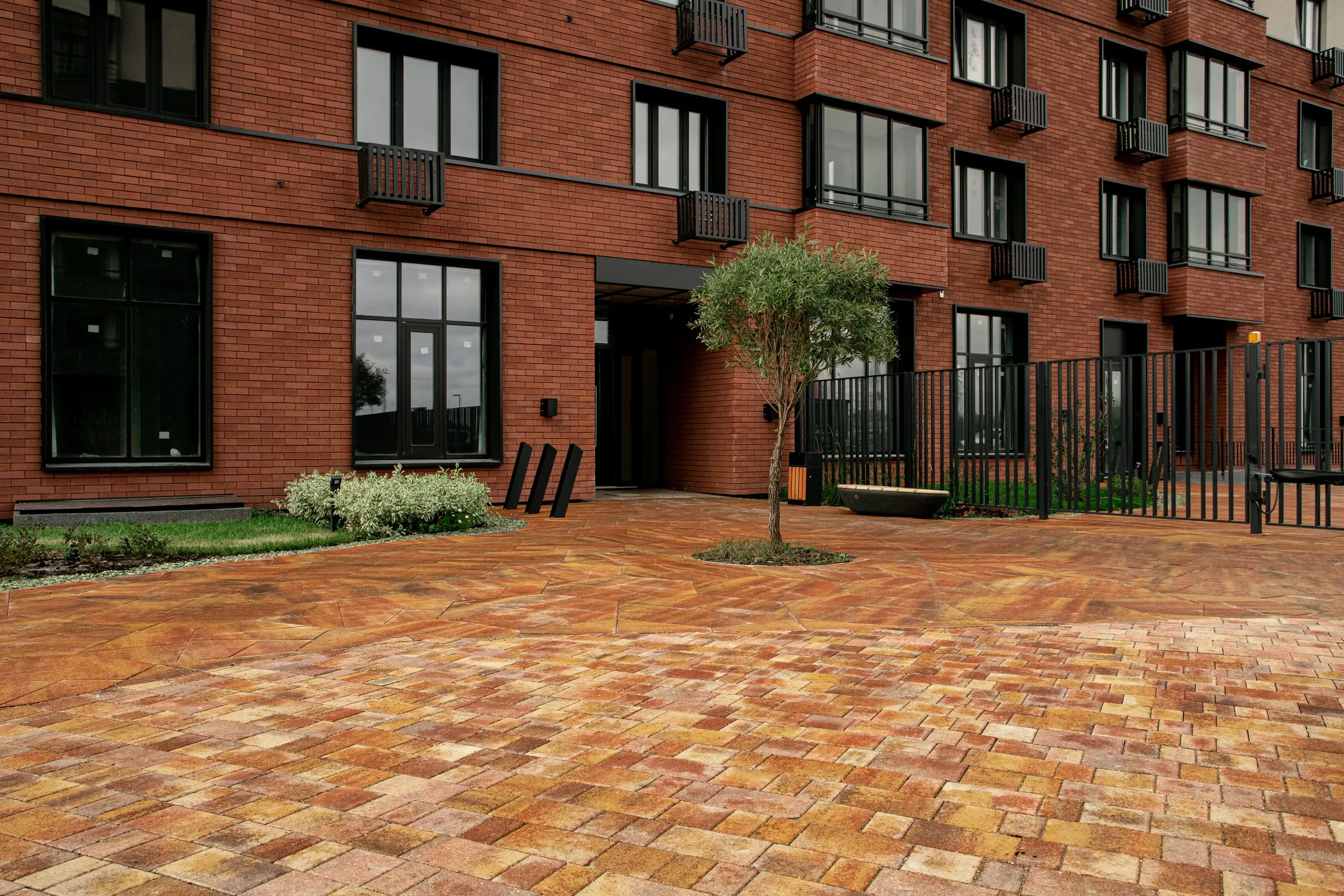 Территория жилого комплекса "О Два" в Тюмени благоустроена с применением твердых покрытий из тротуарной плитки в толщине 60 и 80 мм.