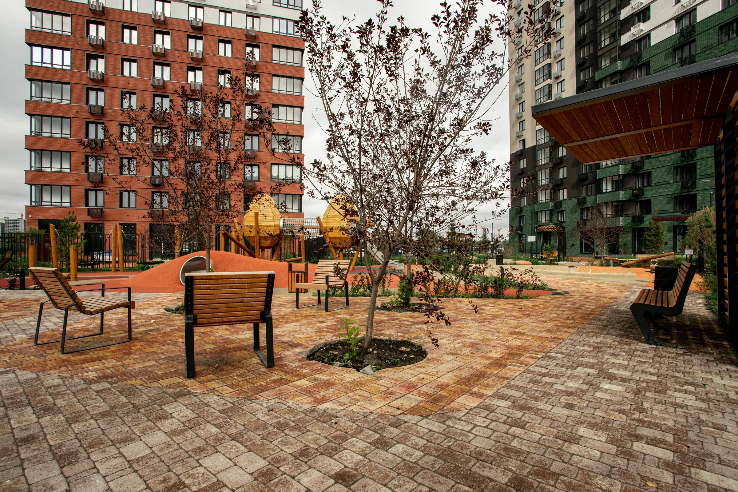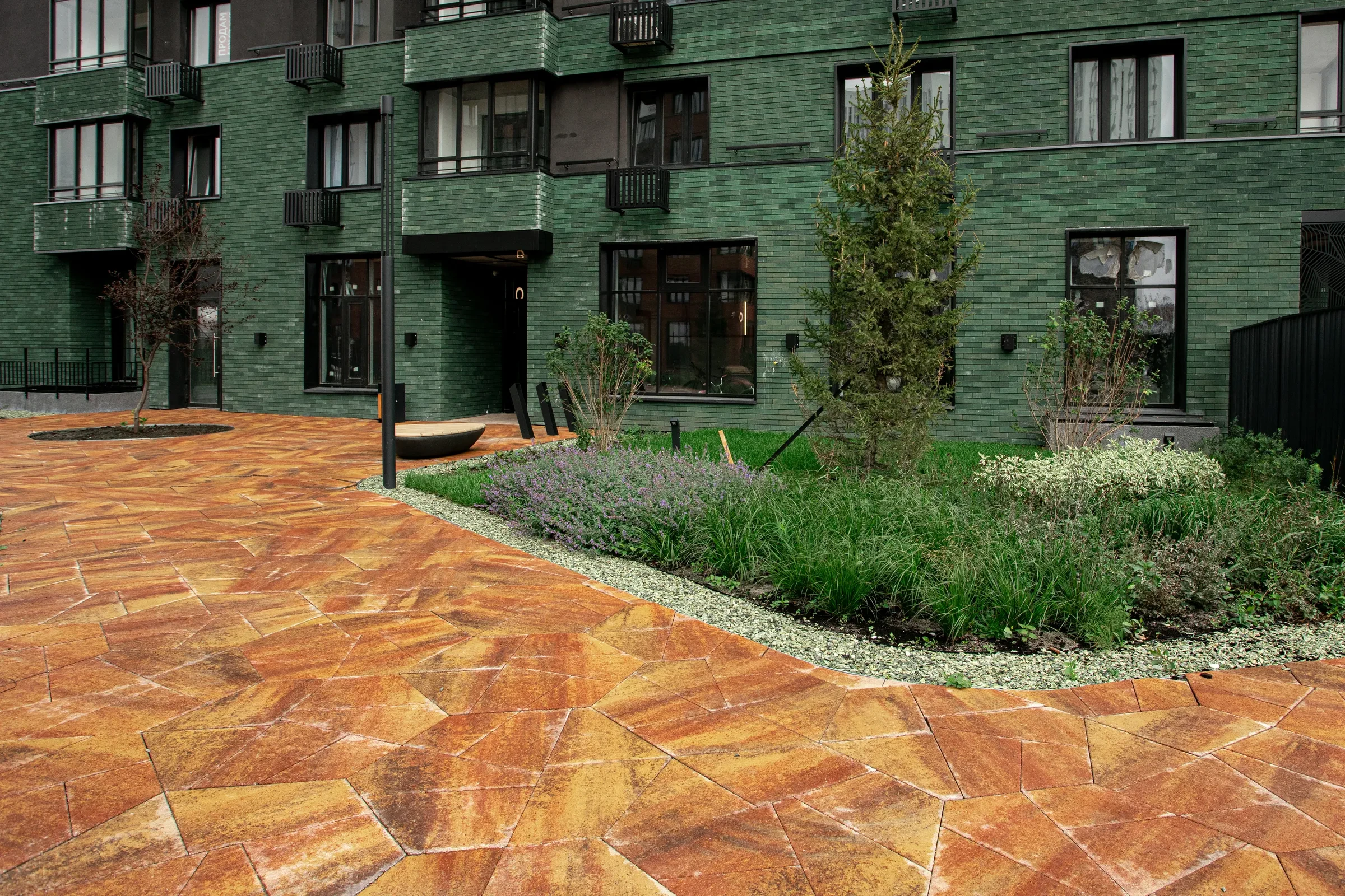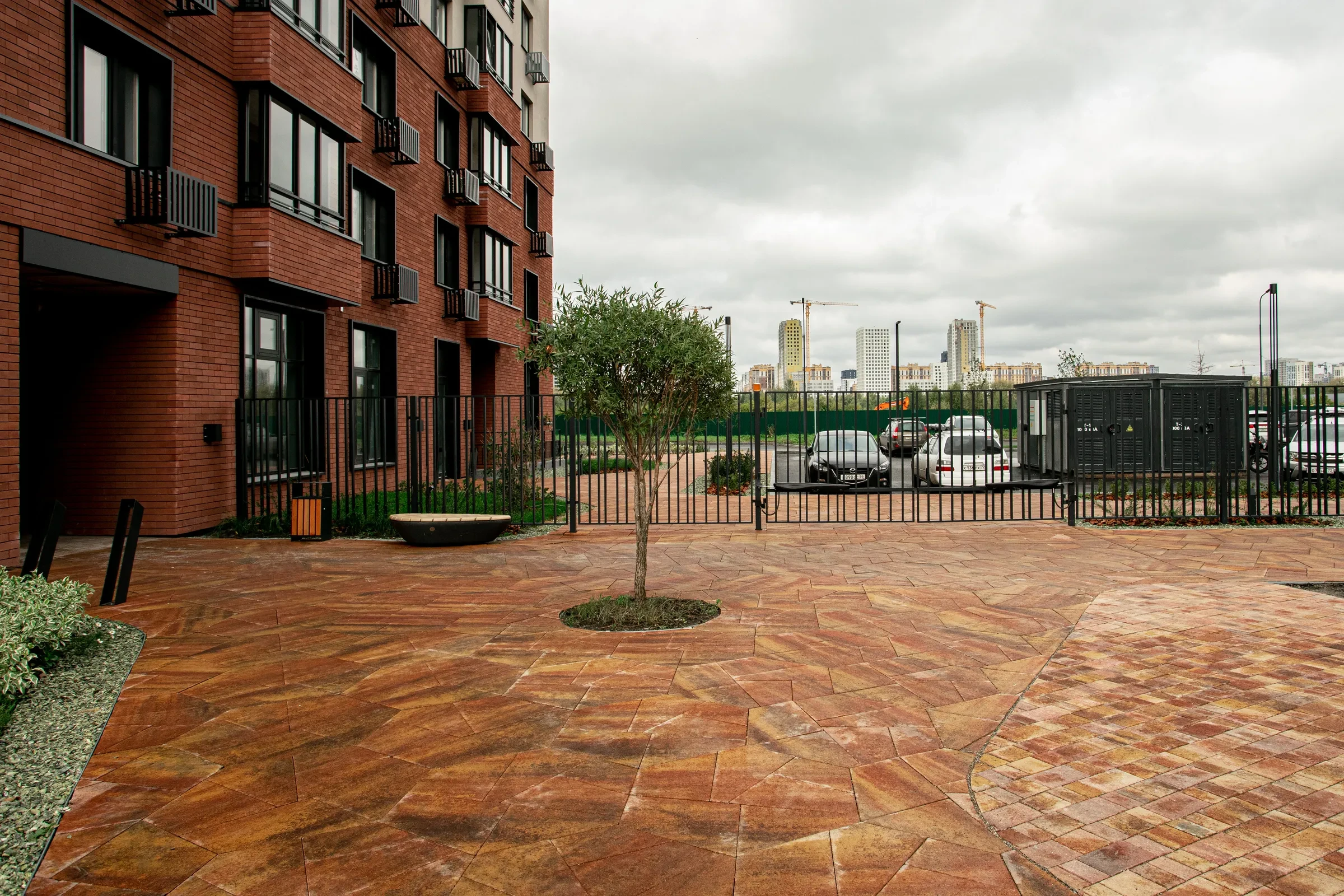 Территория жилого комплекса "О Два" в Тюмени благоустроена с применением твердых покрытий из тротуарной плитки в толщине 60 и 80 мм.
